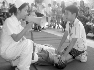 12日是“世界急救日”。市中心醫(yī)院舉行了“急救為人道”為主題的急救技能演示和宣傳活動。在市民的互動參與下,專家還向市民演示介紹了止血包扎、骨折固定等有關(guān)急救技能。該院急診科歐陽主任介紹說,因呼吸心跳驟停引發(fā)的猝死病患者占了急救死亡病例的約60%左右,如果能在盡短的時(shí)間內(nèi)采取正確施救行為,便可以避免悲劇的上演,將傷亡的損失降至最低。