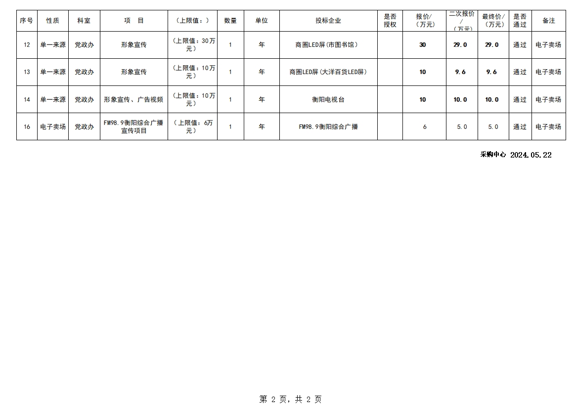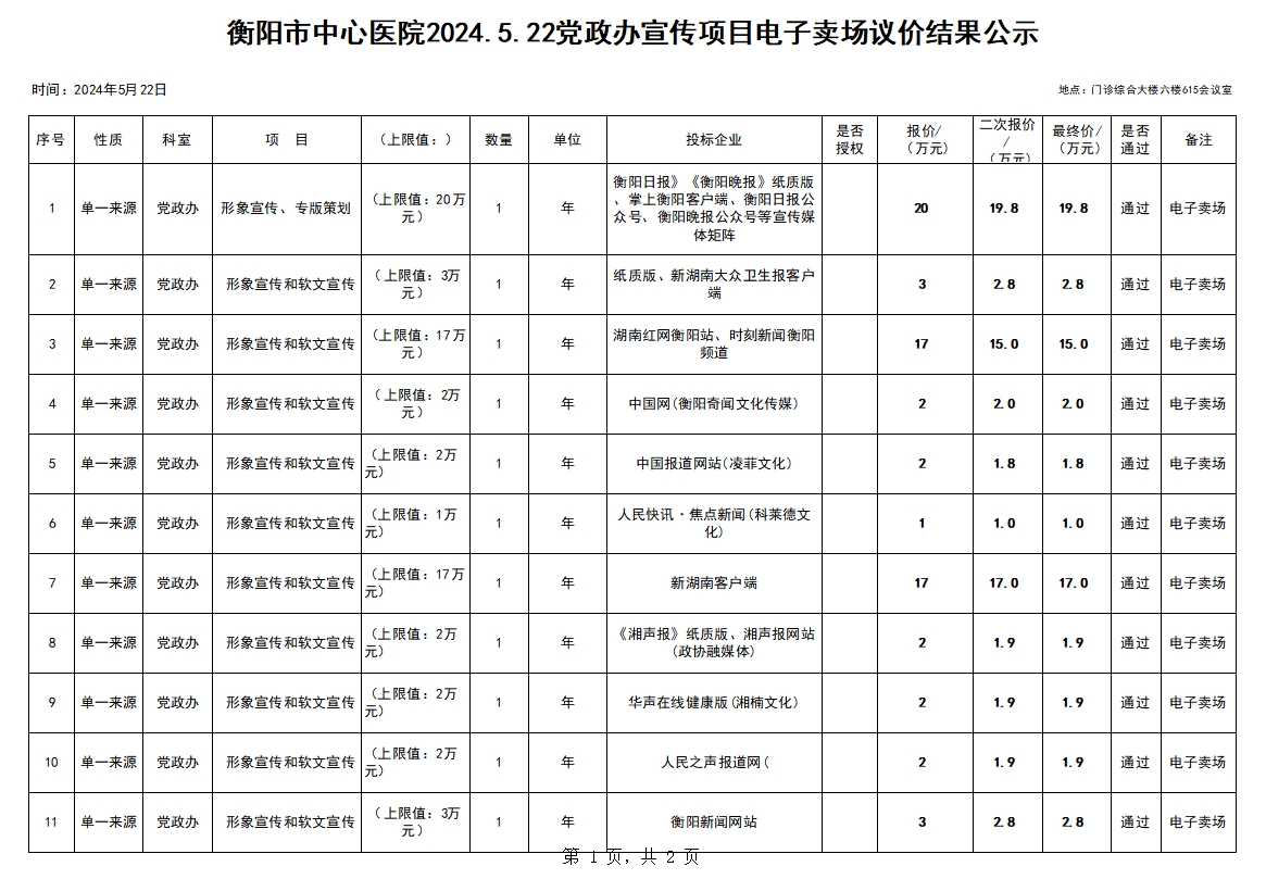 衡陽市中心醫(yī)院2024.5.22黨政辦宣傳項(xiàng)目電子賣場議價(jià)結(jié)果公示