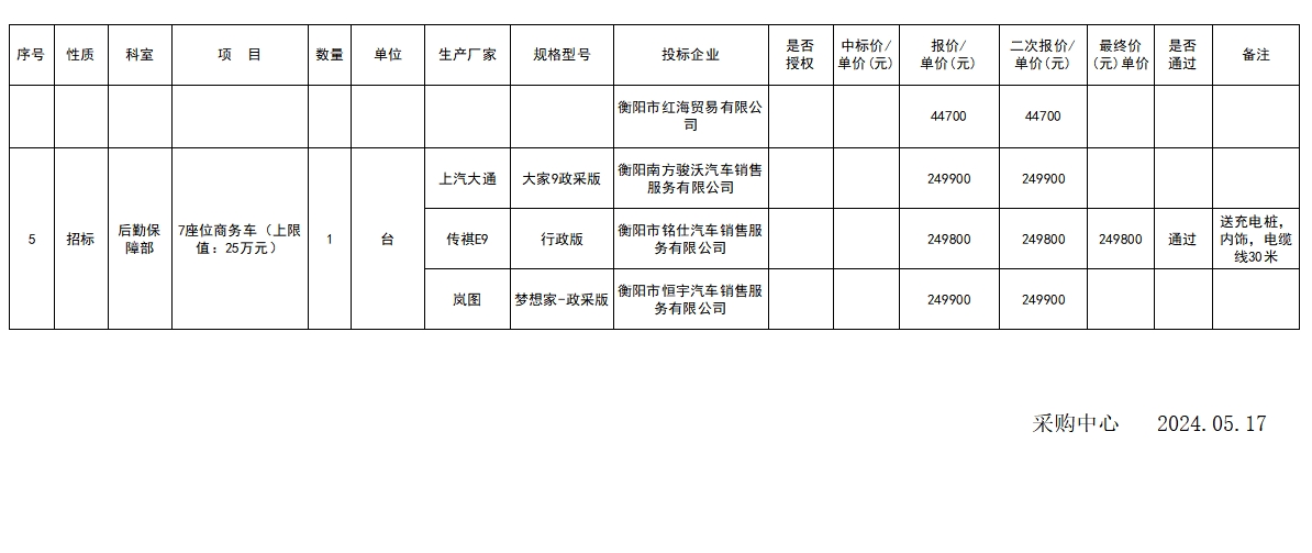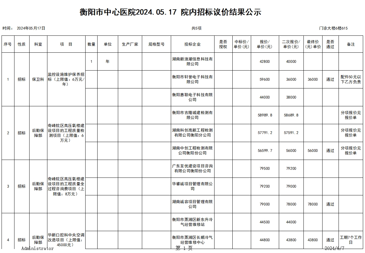 衡陽市中心醫(yī)院2024.05.17院內(nèi)招標(biāo)議價結(jié)果公示