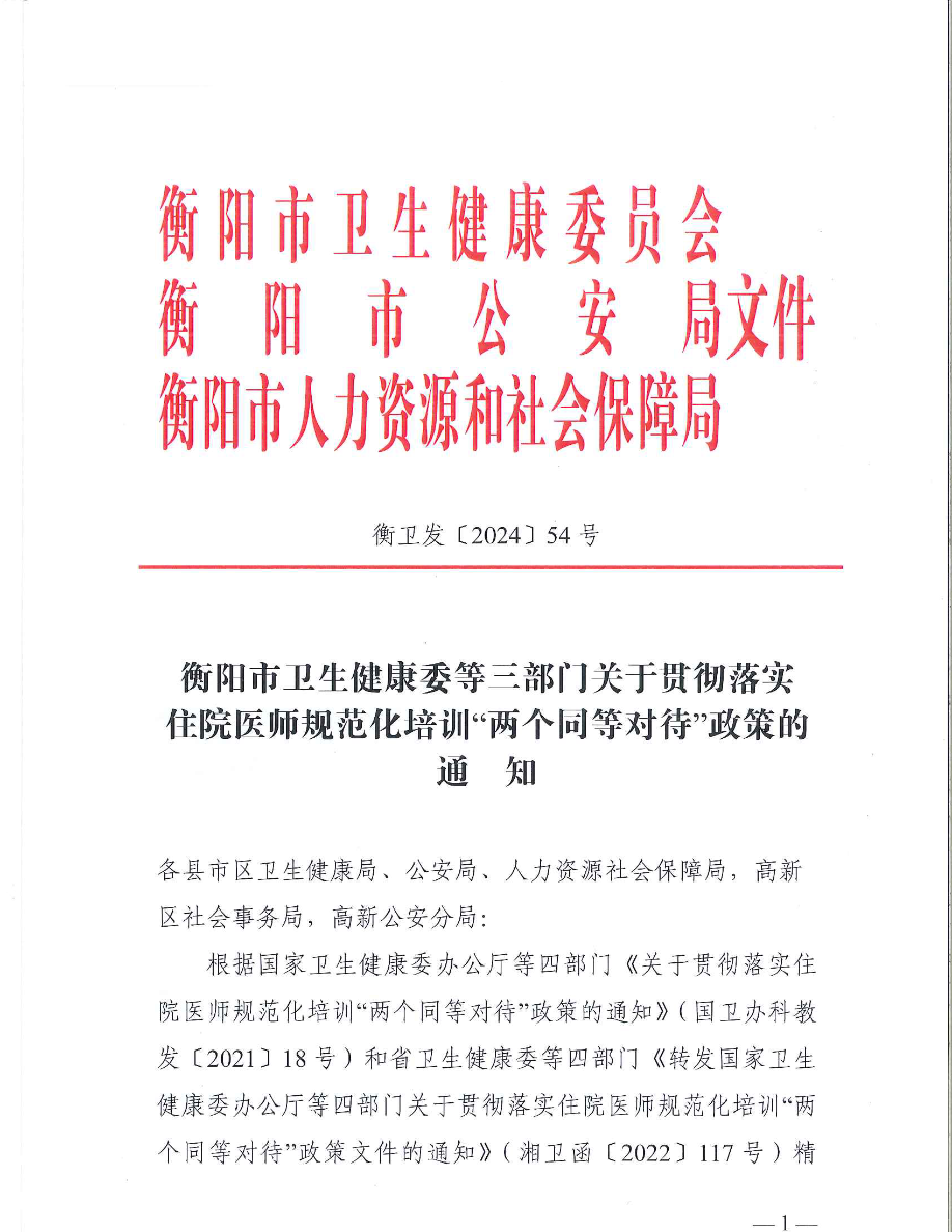 衡陽市衛(wèi)健委等三部門關(guān)于貫徹落實(shí)住院醫(yī)師規(guī)范化培訓(xùn)“兩個同等對待”政策的通知 發(fā)布時間:2024年07月04日 08:47:36 預(yù)覽:2133次
