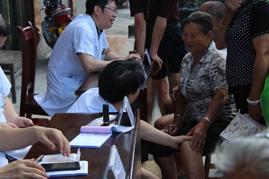 外科支部一行11人早早出發(fā),歷時兩個半小時,游過了衡陽的“新馬泰”(分別是耒陽的新市鎮(zhèn)、馬水鄉(xiāng)、太平圩鄉(xiāng)),終于趕上趕集的鄉(xiāng)親們。在亮源鄉(xiāng)衛(wèi)生院領(lǐng)導(dǎo)和同行的大力支持下,全體隊員主動搬桌子、椅子,9點鐘就鋪開了義診“攤位”。鄉(xiāng)民們看到衡陽大醫(yī)院來了博士、主任和這么多的教授,相互轉(zhuǎn)告,蜂擁而至一下子就將我們的專家圍個水泄不通,直到接近12點,最后一個從鄰近鄉(xiāng)趕來看骨病的鄉(xiāng)親得到專家滿意的答復(fù)后才漸漸散去,我們的專家才緩過神來喝上一口水。