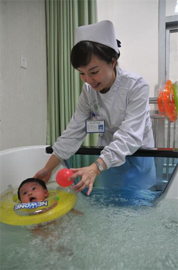 康復(fù)室護(hù)士在給寶寶做水療。