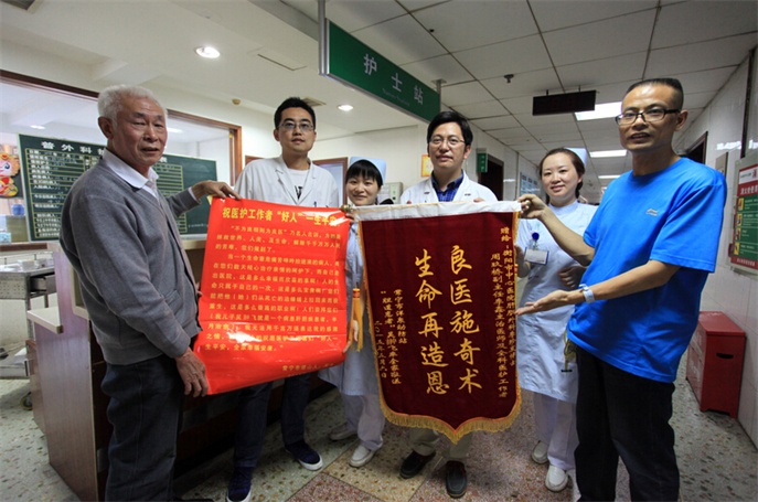 “謝謝你們救了我兒子,要不是你們及時的搶救和精心的照顧,我真不知道兒子會怎么樣呢!” 5月13日,在市中心醫(yī)院肝膽外科上演了感人的一幕,一位白發(fā)蒼蒼的老爺爺和他的兒子將一封感謝信和一幅錦旗送到肝膽外科主任李珍發(fā)等醫(yī)務人員手中,并連說謝謝!