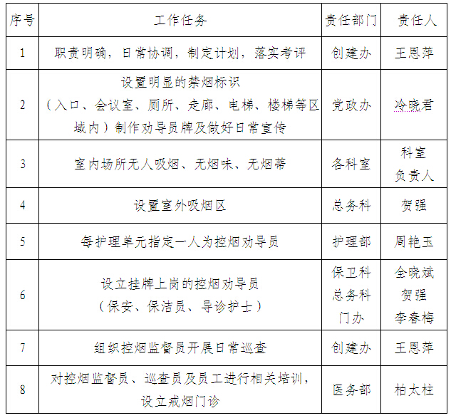 (八)醫(yī)務(wù)人員要掌握控?zé)煹姆椒ê图记?,并主?dòng)積極鼓勵(lì)和幫助吸煙者戒煙,使全院的吸煙率逐年下降。