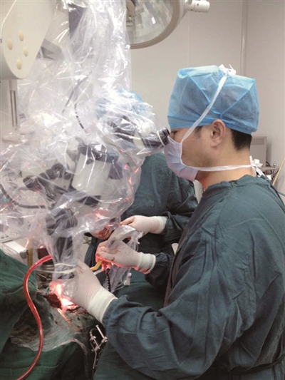 鐘主任正在為患者實(shí)行腦動(dòng)脈瘤顯微夾閉術(shù)。