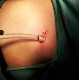 微創(chuàng)胸腔鏡手術(shù)是在胸部打幾個(gè)洞,其中通過(guò)一個(gè)洞放一個(gè)胸腔鏡到胸腔里面去(類似攝像頭,可把畫(huà)面?zhèn)鬏敵鋈ィ?,主刀者通過(guò)外面的顯示屏幕觀察胸腔內(nèi)的結(jié)構(gòu),其他幾個(gè)洞伸入手術(shù)器械、相互配合,把病灶切掉。