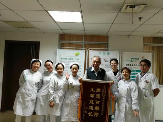 “感謝丁菁主任,感謝劉賽醫(yī)生,感謝羅護(hù)士長(zhǎng),感謝所有醫(yī)務(wù)人員的悉心照料,感謝……”,劉爺爺一邊道謝,手里還一邊拿著一面鮮紅的錦旗,杵著拐杖緩緩走向護(hù)士站,親自將寫著“病殘可解除,生命能延長(zhǎng)”的錦旗交給我們,以表達(dá)他對(duì)醫(yī)生精湛醫(yī)術(shù)和醫(yī)護(hù)人員周到服務(wù)的感激之情。