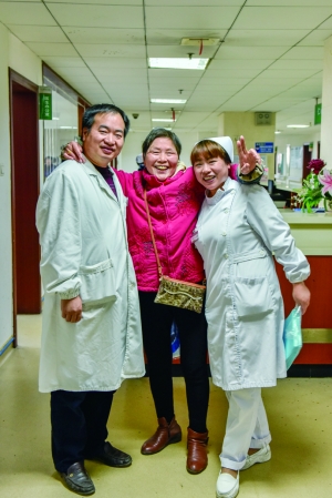 周福蘭(中)與醫(yī)生唐玉成、護士胡林君的親密合影