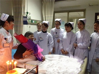 第二個(gè)故事發(fā)生在去年12月,80歲的汪奶奶因膽總管結(jié)石疼痛得厲害,被送到衡陽(yáng)市中心醫(yī)院肝膽外科住院治療。12月10日是汪奶奶的80歲生日,上午9時(shí),肝膽外科的護(hù)士們的白衣天使們捧著生日蛋糕和一束康乃馨,唱著歡快的生日快樂歌走到了她的床邊,“奶奶,今天是您的生日,我們給您祝壽來了!”護(hù)士長(zhǎng)許敏帶領(lǐng)全體護(hù)士姐妹們齊聲為老人送上了飽含祝福的吉祥話,祝愿老人健康長(zhǎng)壽。在生日蠟燭的燭光下,奶奶露出了溫暖而又真摯的笑容,老人說這是她有生之年過得最開心的一個(gè)生日?,F(xiàn)場(chǎng)濃厚和溫馨的場(chǎng)面,不僅讓汪奶奶特別激動(dòng),就連其家人和同病房的病友也感動(dòng)地流下了熱淚。